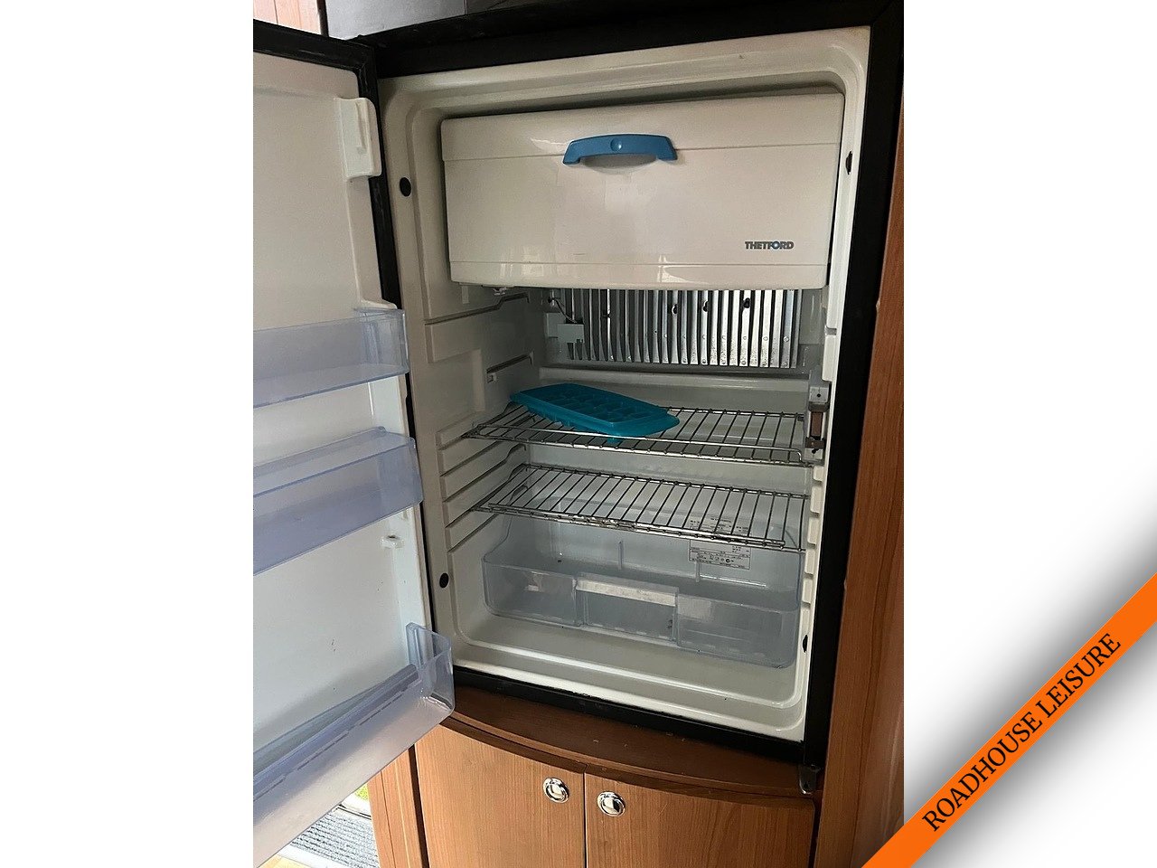 Going to the kitchen is an area to cook and wash up with a stainless steel sink and seperate drainer, and also a 3 burner hob all with glass hinged covers. It has a seperate Thetford gas oven with a grill. With 4 drawers for your kitchenware. Opposite is a large fridge 3 way Thetford fridge, thats has a salad drawer, and side shelves and a freezer, with a medium sized cupboard underneath, and above.