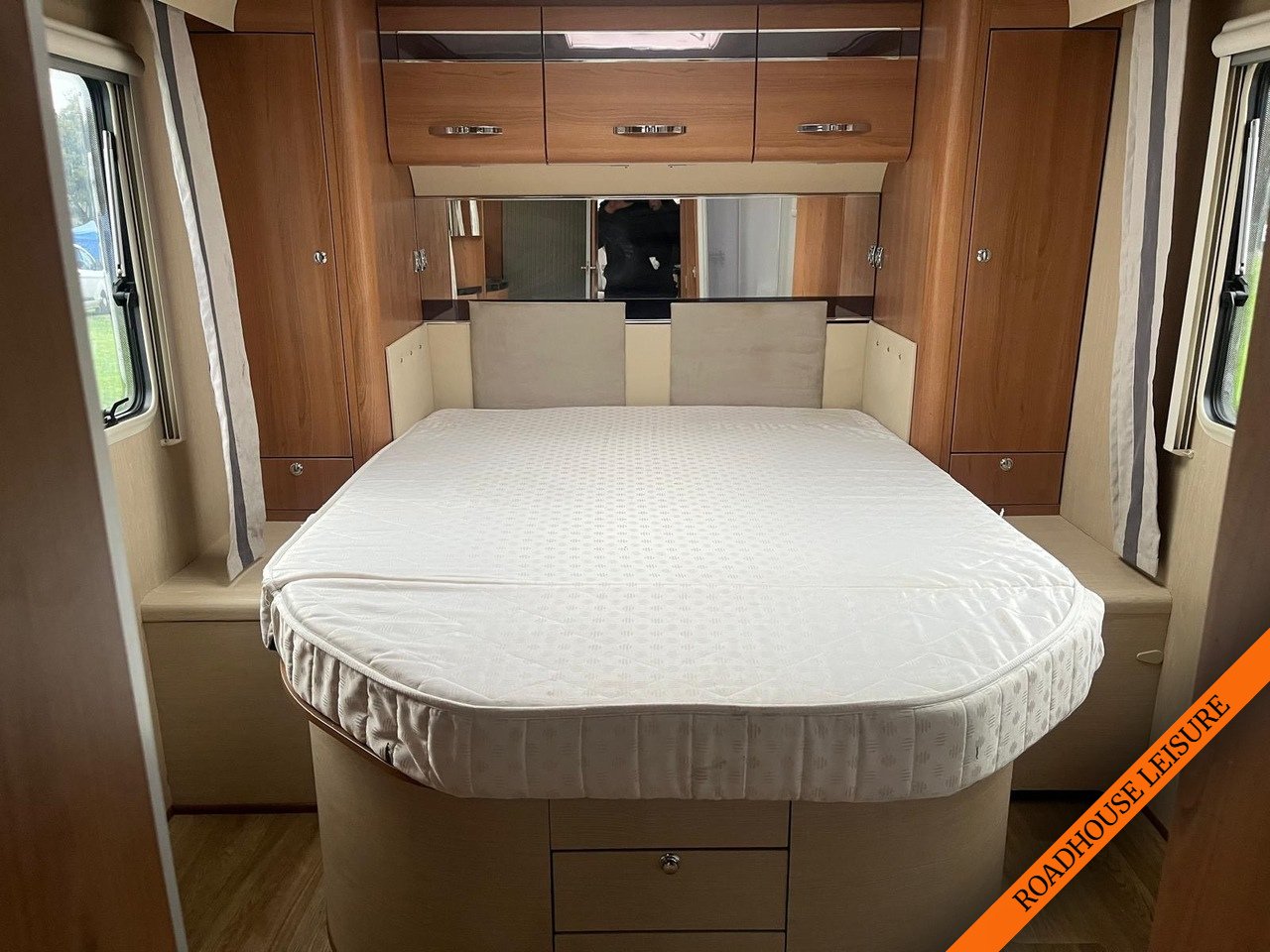 Coming into the bedroom / showerroom area this can be completely seperated off with a sliding door. To the left is a toielt washroom with a cassette toilet, sink and cupboard, Mirrored cupboard, and LED lighting, with a sliding semi circular door for privacy, to the right is a seperate shower room and door. The large bedroom has a fixed island double bed set into surrounding wood wardrobe and cupboards to give it a modern stylish look, with chrome handles. The bed also has a headboard and mirror with lightswitchs either side. There are two windows and a skylight in the bedroom, it is very light and airy.